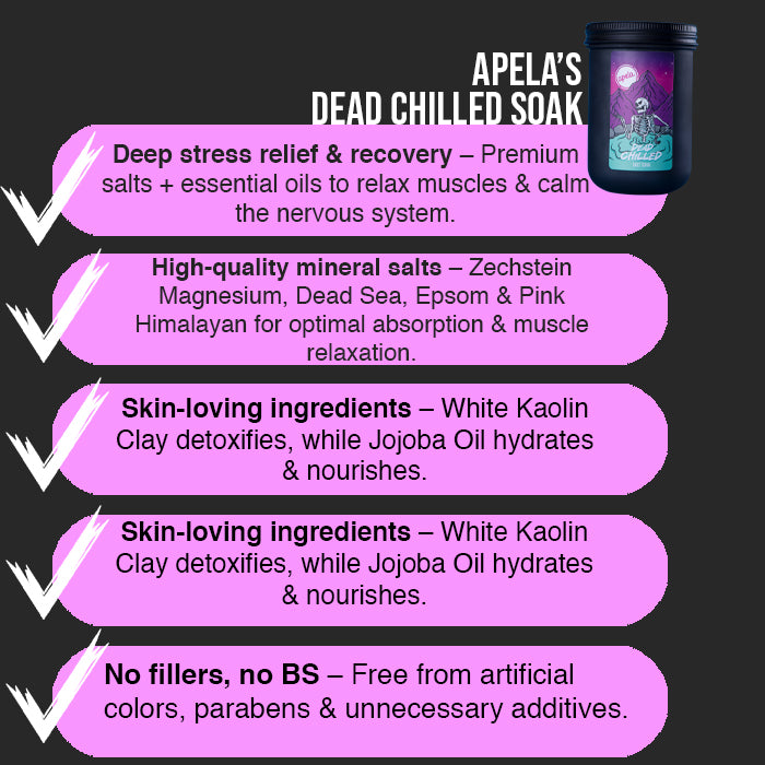Every Dead Chilled Salt Soak is crafted with hand-selected, natural ingredients designed to help your body & mind unwind, recover, and reset—just as Mother Nature intended.